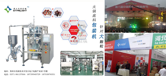星火公司為了迎接重慶第八屆火鍋美食文化節(jié),為廣大廠家?guī)?lái)了不同系列的火鍋底料包裝機(jī),這些設(shè)備可以包裝不同款式的火鍋料產(chǎn)品,比如:火鍋底料自動(dòng)包裝機(jī)、火鍋底料包裝生產(chǎn)線、小袋裝火鍋調(diào)料包裝機(jī)以及紅油火鍋底料包裝機(jī)等系列設(shè)備,這些設(shè)備為重慶火鍋美食節(jié)增添了異樣的色彩。在此會(huì)展上有多家知名火鍋底料品牌企業(yè)例如:成都六婆、重慶鄉(xiāng)香閣巴鼎紅火鍋、成都九味軒、南京愛(ài)味思 成都十